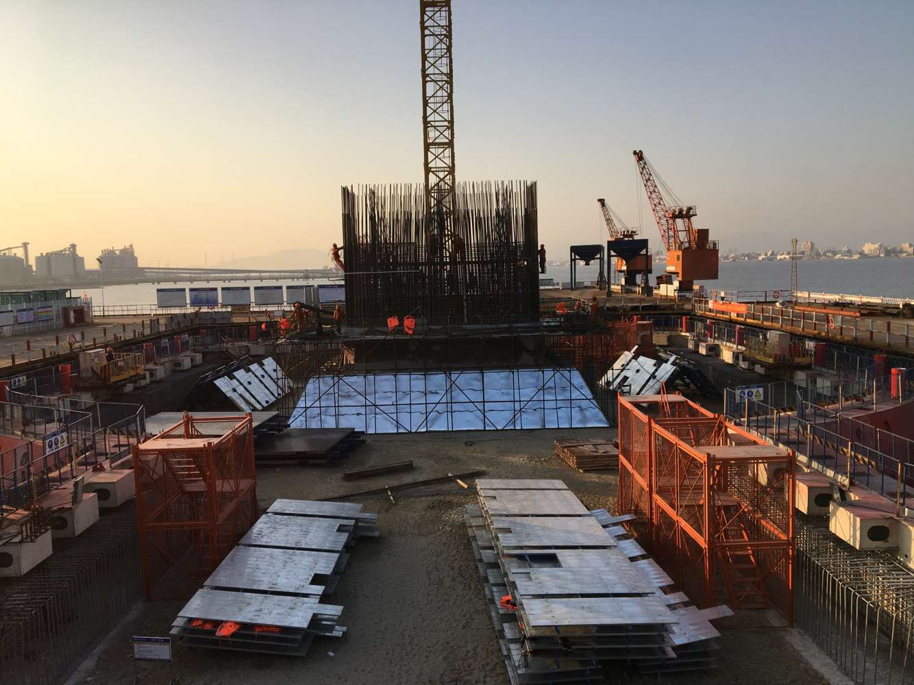 南塔含塔座高144米,根据总体施工安排,共分为32个节段。首节单个钢筋使用量24吨,采用C50海工混凝土,浇筑高2米,平面尺寸长11米,宽7米,浇筑方量130方。