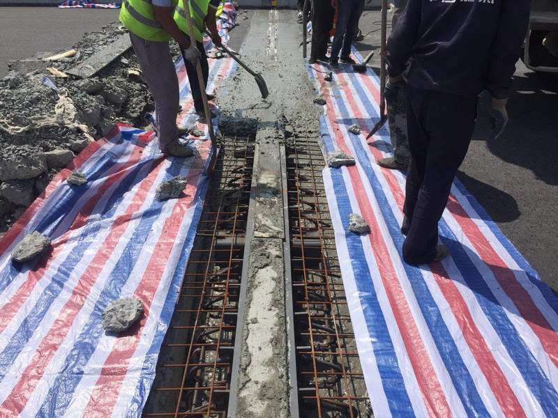 伸缩缝施工是桥梁施工的一道关键工序,也是桥梁病害最容易出现的部位,施工过程中的质量控制尤为重要。施工前,项目部严格把关材料进场,所有伸缩缝产品通过优选采购,且通过抽检合格后才允许安装。施工过程中,项目部技术人员严格按照施工图纸及技术规范做好切缝、凿毛、清理、焊接、砼浇筑、砼养生等各道关键工序,以确保工程质量。