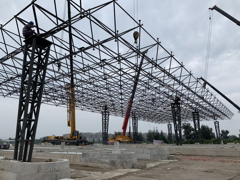 灵昆收费大棚主体是大跨度钢网架结构,桁架截面长度为68.8米,宽度为23米,8根立柱高7.8米的位置与桁架连接,总重约32吨。收费大棚整体采用螺栓球轴杆连接,施工测量精度要求极高,吊装施工难度较大。为保证吊装顺利完成,项目部提前部署、科学统筹,制定周密吊装施工方案,召开质量、安全专题会议进行技术交底,并请监理单位质量、安全监理工程师现场指导。整个吊装工作井然有序,起吊、调整、找正、吊装等工序一气呵成。