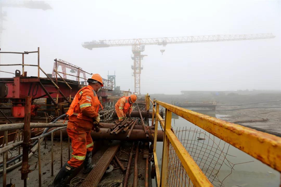 在瓯江北口大桥施工现场,电焊工人已经开始焊接工作,塔吊的吊装工作也在有序进行,手持遥控的工作人员正在吸泥机旁开展沉井清基的作业,现场施工有条不紊。