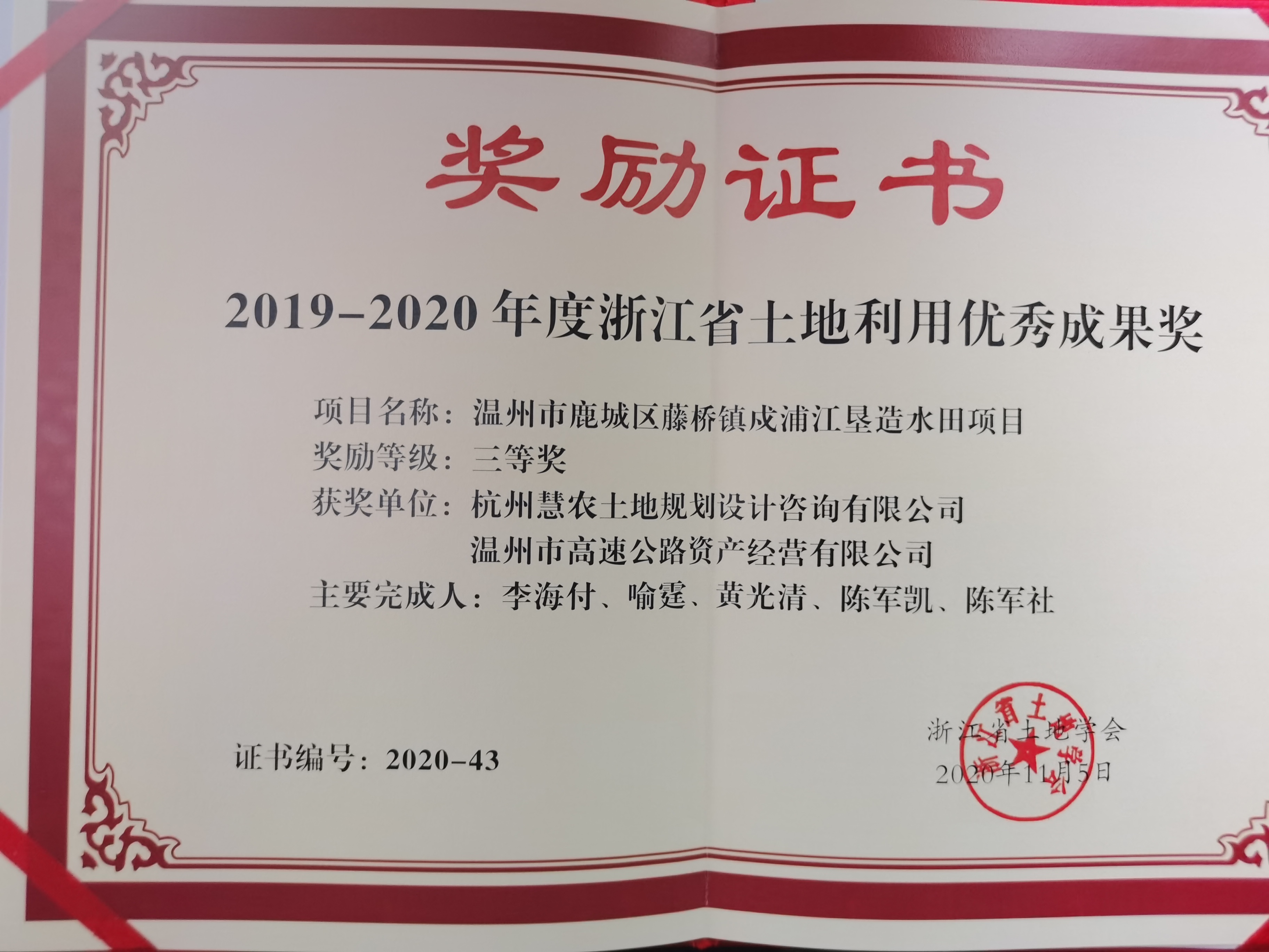 近日,由经营公司牵头实施的温州市鹿城区藤桥镇戍浦江垦造水田项目获得了“2019年—2020年度浙江省土地利用优秀成果奖”。