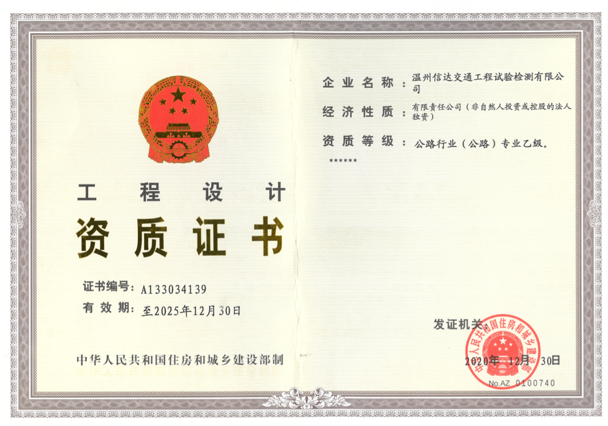 近日,经国家住房和城乡建设部核准,温州市信达交通工程试验检测有限公司获批公路行业(公路)专业乙级资质。公路行业(公路)专业乙级资质申报,人员及业绩材料要求繁多,审批流程严格,通过率较低。公司申报工作从2019年下半年开始着手,历时一年有余,辗转经国家交通运输部及住房和城乡建设部专家联合审查,最终顺利取得。该资质可承接二级、三级、四级公路工程项目的主体工程及其交通安全、管理、养护等配套工程的设计业务。