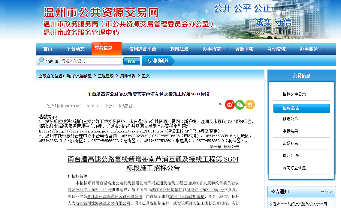 8月9日,甬台温高速公路复线新增苍南芦浦互通及接线工程施工招标公告在温州市公共资源交易网上发布,标志着本工程顺利进入实施准备阶段,为项目开工建设奠定坚实的基础。