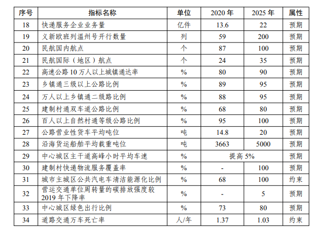 根据《规划》,到2025年,温州基本建成“畅达国内国际、引领区域协同、统筹开放融合、更加绿色智能”的全国性综合交通枢纽;完成综合交通投资2200亿元,新增综合交通网总规模2000公里,较高水平建成3个“1小时交通圈”,基本形成“521”高铁时空圈,港口集装箱吞吐量突破200万标箱,机场旅客吞吐量力争2500人次;中心城区“两主三辅“综合客运枢纽格局基本形成,综合客运枢纽平均换乘时间8分钟,实现5万人以上乡镇15分钟上高速,基本实现万人以上乡镇通二级路(含二级以上);快递量突破22亿件,邮政行业业务总量达到160亿元;全市综合交通产业增加值超1000亿元,3A以上物流企业突破100家。