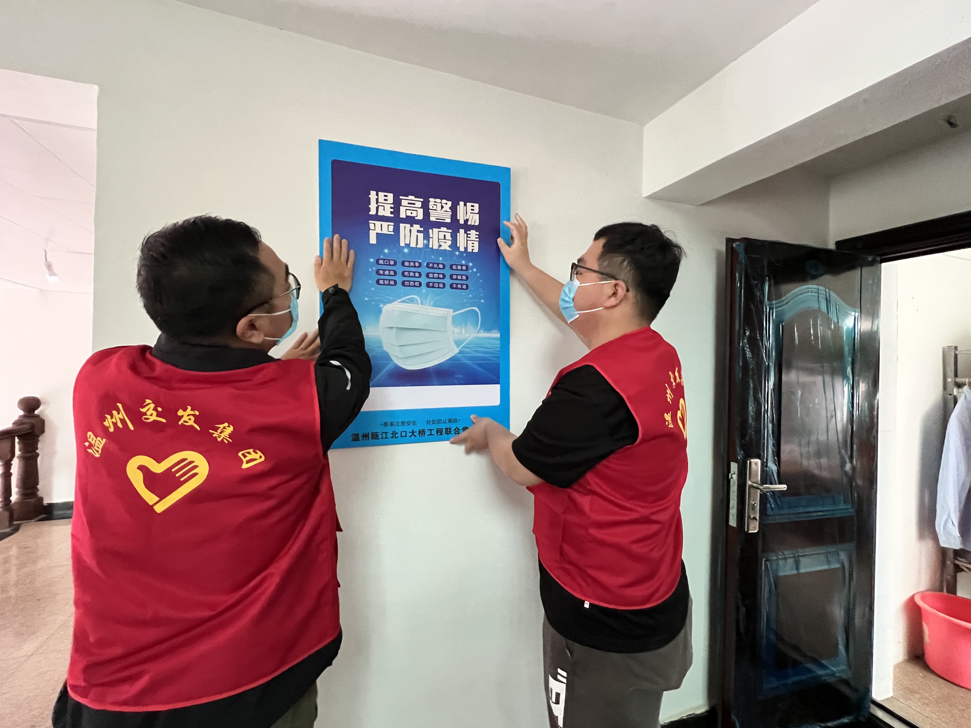 当前疫情防控形势严峻复杂,提升群众对疫情发展和防控的重视程度,3月17日下午,在雨雾天气桥面铺装施工暂停之际,瓯江口大桥公司党团志愿者前往路面一标工人宿舍开展抗疫宣传志愿活动。