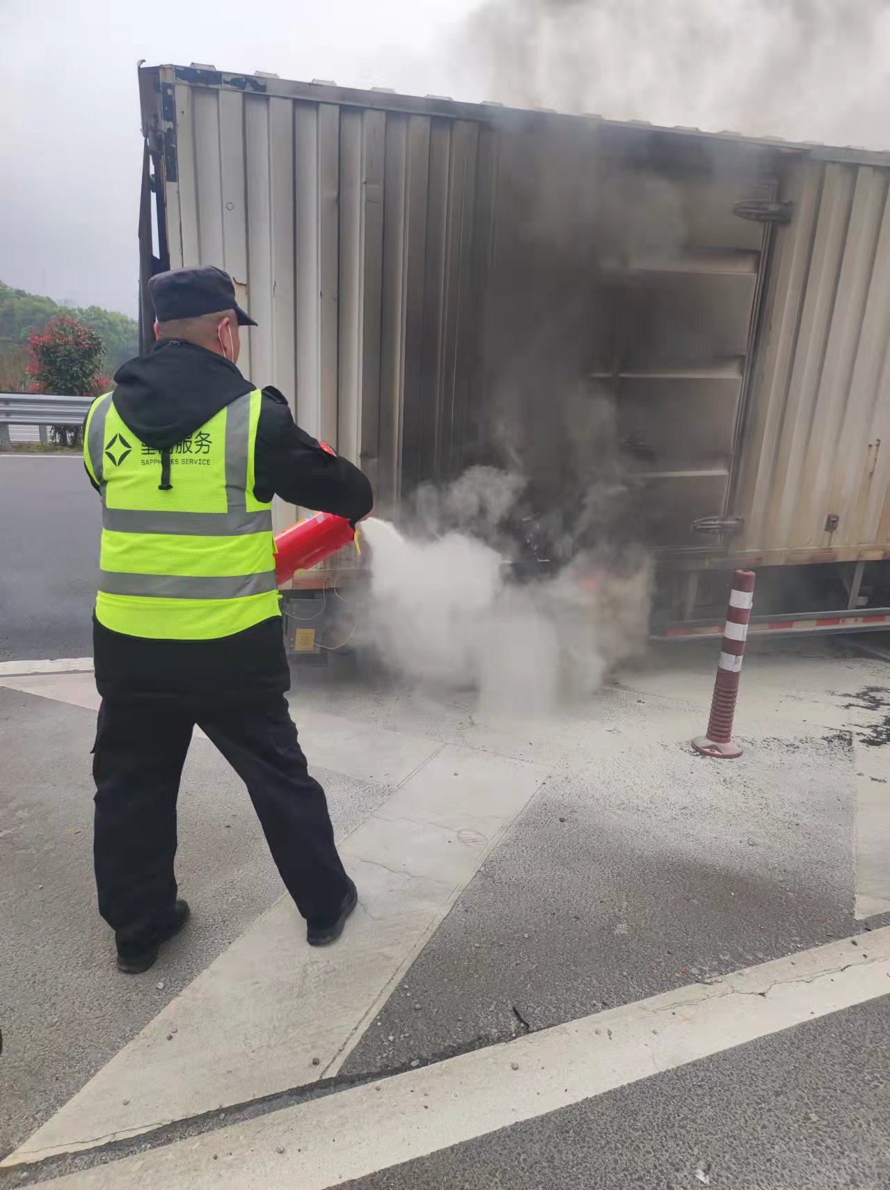 根据火灾应急演练的经验,包道缪迅速作出判断,用对讲机紧急呼叫当班队员支援,就近取来灭火器第一时间冲向起火小货车,同时向交警及监控中心、上级领导通报现场火势情况,并协助货车司机报火警。此时货车后轮处浓烟滚滚,火势已蔓延至车身,情况非常紧急,包道缪根据平时消防演练时的应急处置方法展开了一系列的灭火工作,在消防车辆未到达现场前,对火势进行了有效控制,阻断了事故的恶性发展,给车主挽回了一定的经济损失。