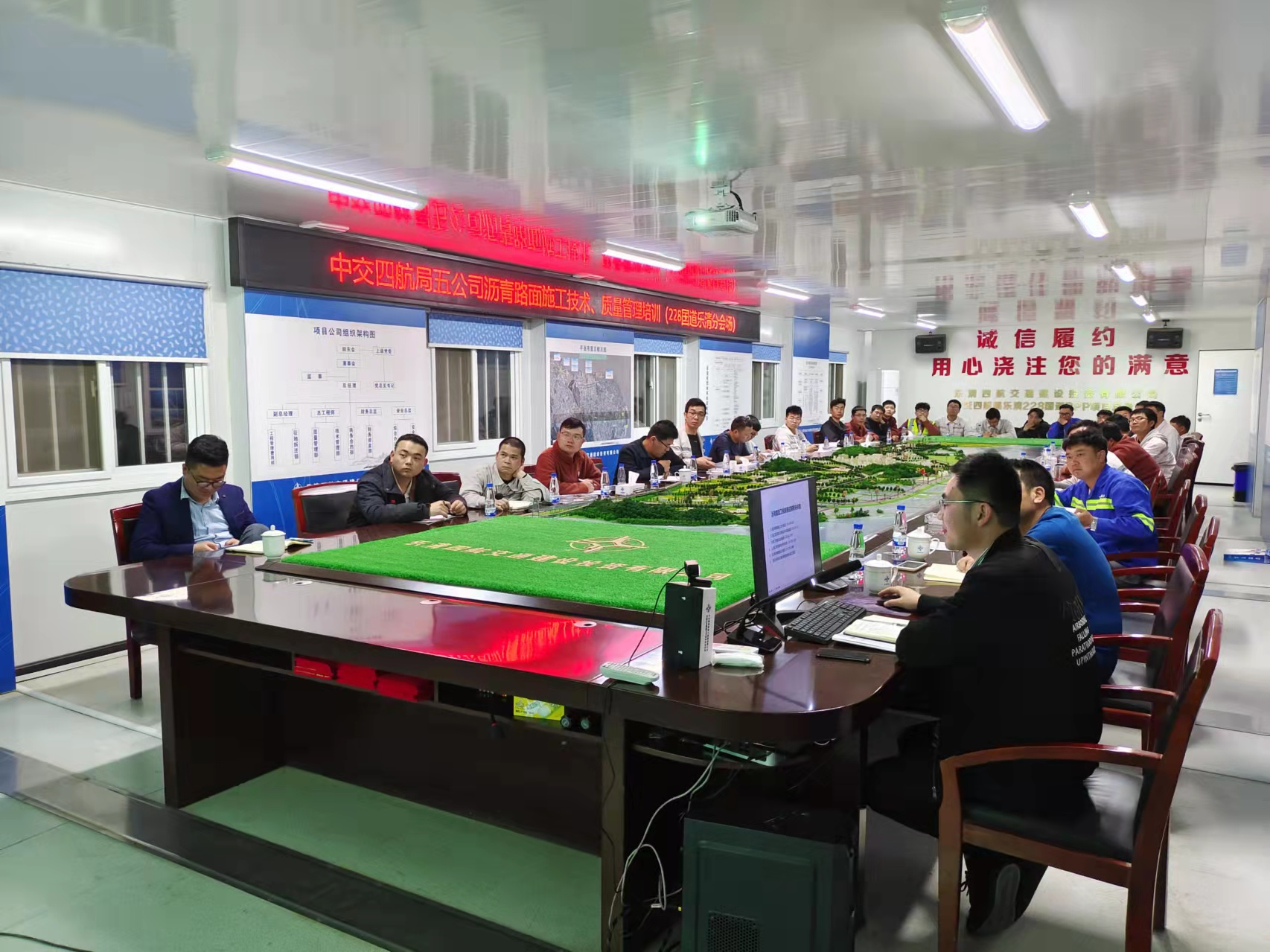 4月7日晚上,温州市交通工程试验检测有限公司沥青路面技术服务团队到228国道乐清段,采用线上线下同时进行的方式,对沥青路面施工技术进行交底,并就质量管理进行专题培训。此次培训设立主会场和分会场,以视频会议的模式进行,线下设在乐清分会场,线上则分布在中交四航局五公司总部、228国道苍南段及其它有关项目部,共有80余人参加。