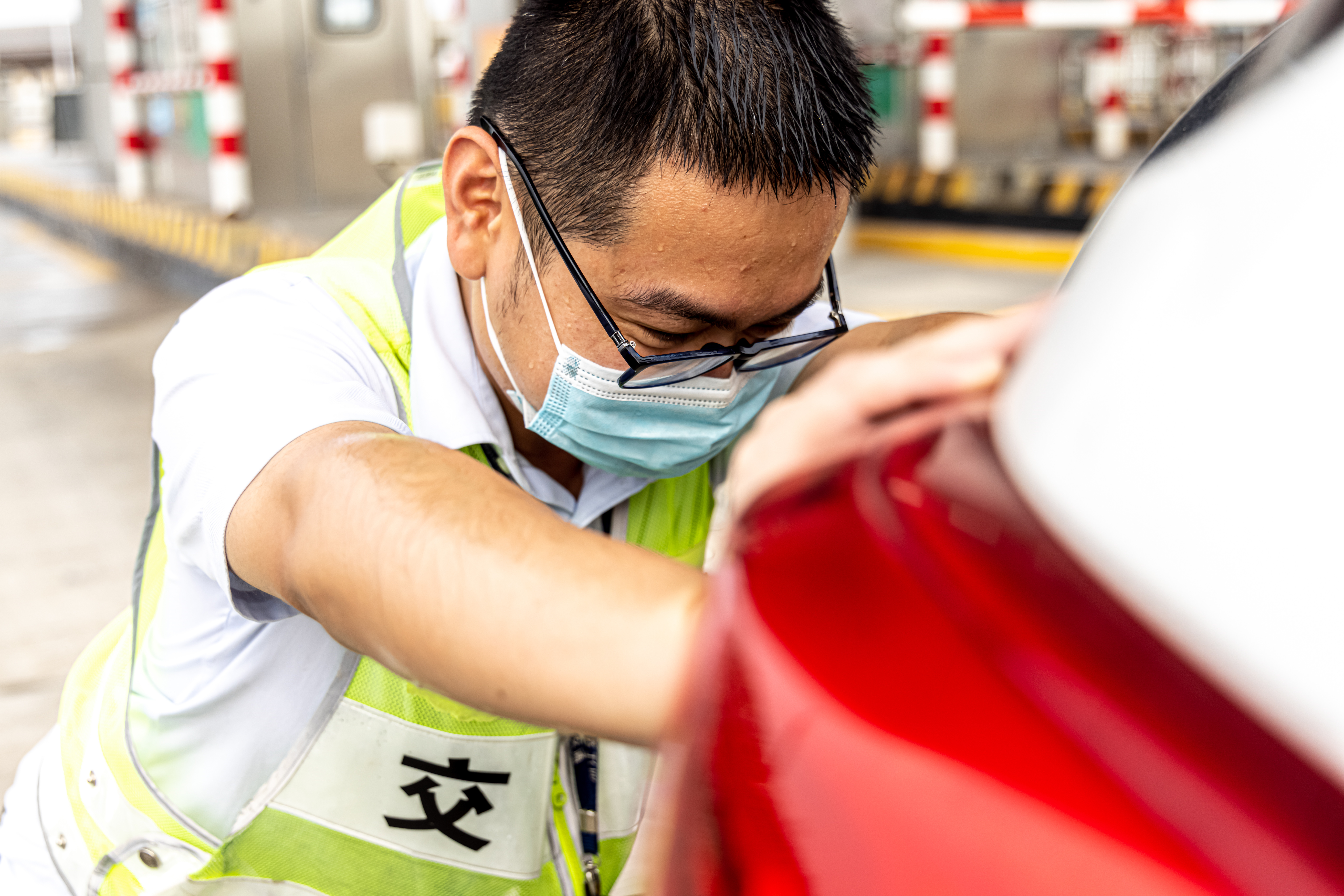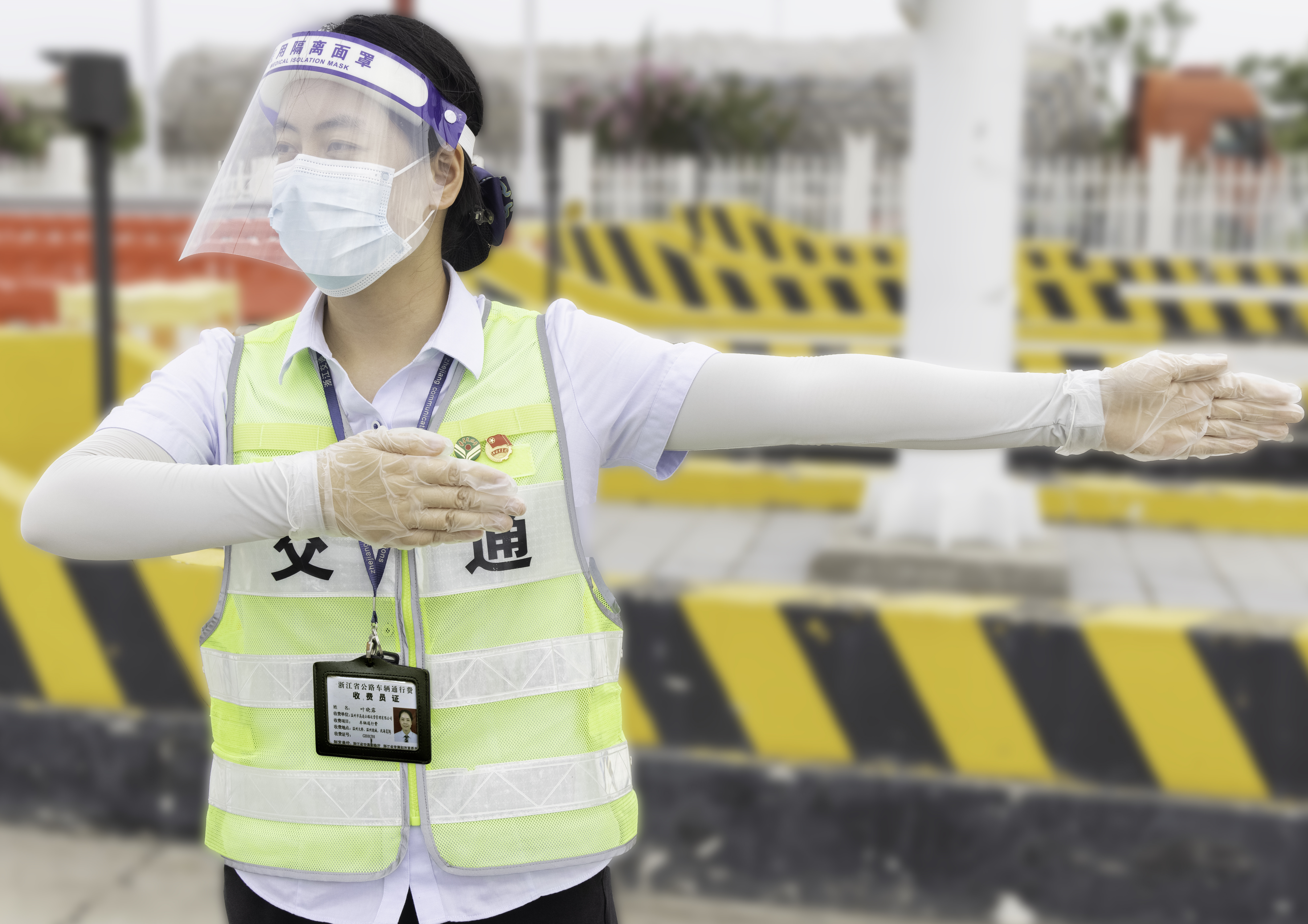 7月18日下午15时,室外温度超过40℃,阳光炙烤与车辆的热气包围着瑞安东收费站。因疫情管控,对收费站的车辆通行带来了压力,为维持通行秩序,负责现场管控的收费员全副武装,维护收费站秩序。身上衣服湿了干、干了湿,面罩里全是蒸汽,模糊双眼,让人心慌气闷,但她仍坚守岗位,一丝不苟地完成收费站入口管控工作,不畏热浪,“炎”值最美。
