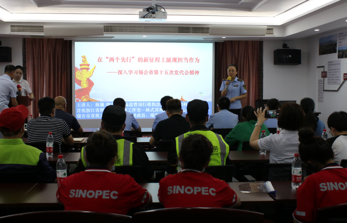 为学习贯彻落实省第十五次党代会精神,确保大会精神落地落细落实,团结带领全体党员干部唯实惟先、实干争先,共同谱写奋进“两个先行”新征程的壮美篇章,7月22日下午,“瓯江红·畅美高速”温州交发集团党群服务中心联合交发集团、经营公司、工程公司、高速执法队、高速交警队、中石化加油站等联盟单位组织开展“省第十五次党代会精神专题党课宣讲”活动。