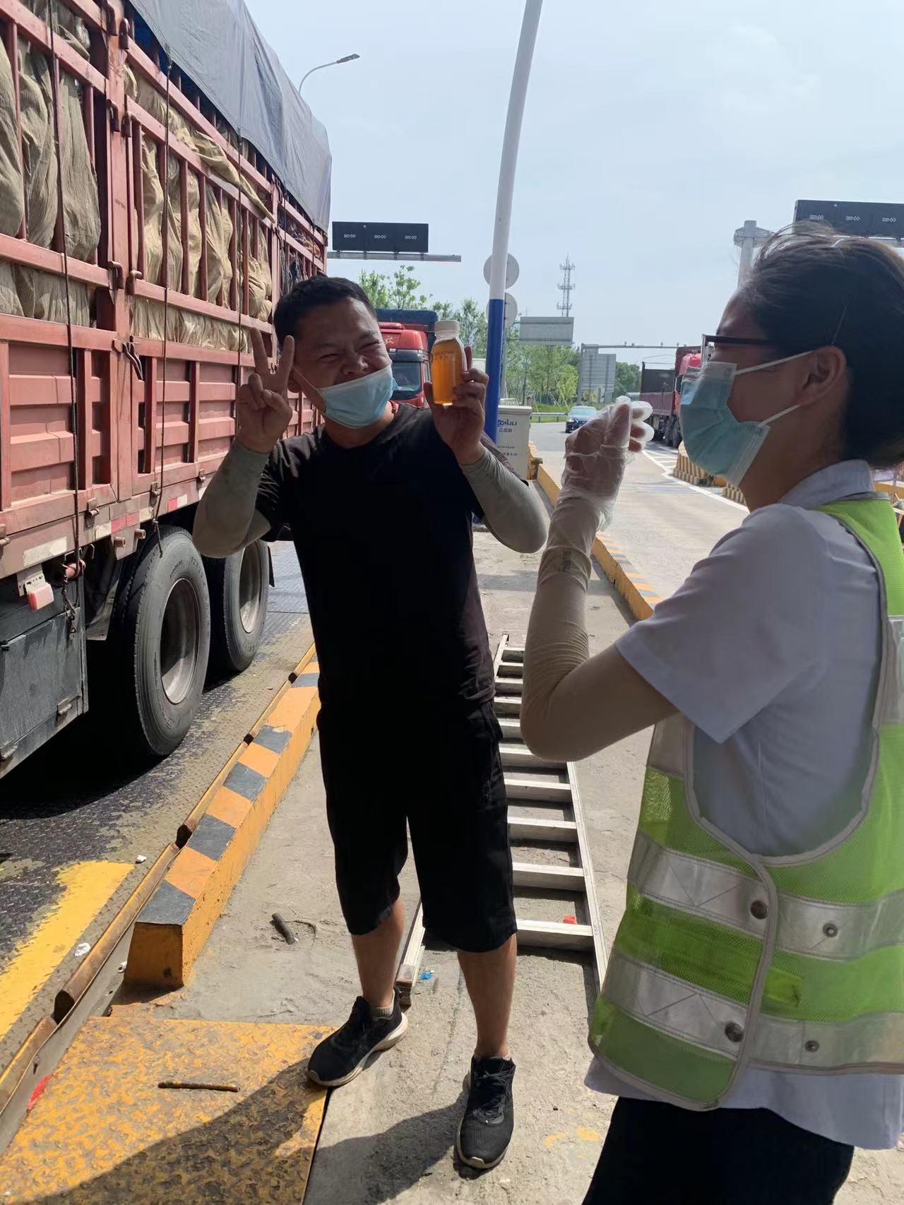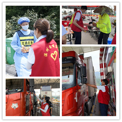 活动中,志愿者们为过往司乘人员和收费站防疫人员送上茯茶等夏日清凉物品,并叮嘱他们注意防暑降温。“师傅,天气很热,请您喝瓶茯茶消消暑吧!”,看着一位热的满大汗的货车司机,志愿者热情地将手中的茯茶递了上去。