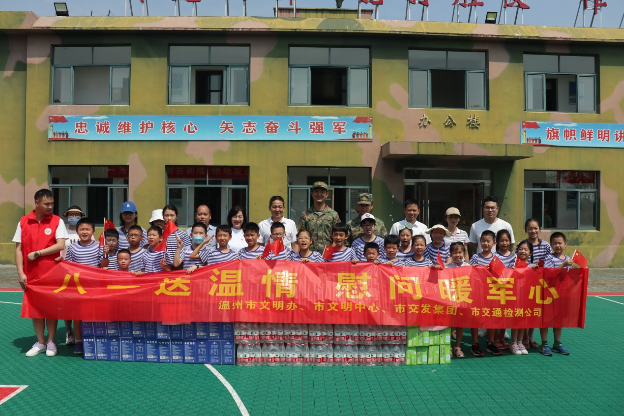为贯彻落实习近平总书记关于家庭、家教和家风的论述,进一步涵养家国情怀,弘扬家庭文明新风尚,8月1日,市文明办、市文明中心、best365足球官网联合文明联盟各成员单位到驻温某部队举办“涵养家国情怀 共建文明家庭”庆“八一”活动。活动由温州交通检测公司承办,“文明联盟”共建单位及交发集团系统各单位职工适龄儿童共40余人参加。