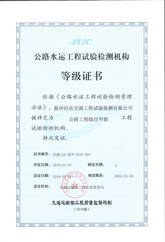 信达检测公司系温州市交通发展集团有限公司下属国有独资企业(三级),成立于2008年4月,经十余年发展,公司现已成长为浙江省内公路工程试验检测能力最强、规模最大、项目参数最全的试验检测机构之一。同时,公司为国家高新技术企业、全国青年文明号单位,具备交通运输部公路工程综合甲级、公路工程设计乙级、特种工程(结构补强)专业承包、建设工程质量检测(见证取样、地基基础、主体结构)等资质,是专业为公路、铁路、市政、机电、智慧交通等领域提供技术服务的综合性检测机构。