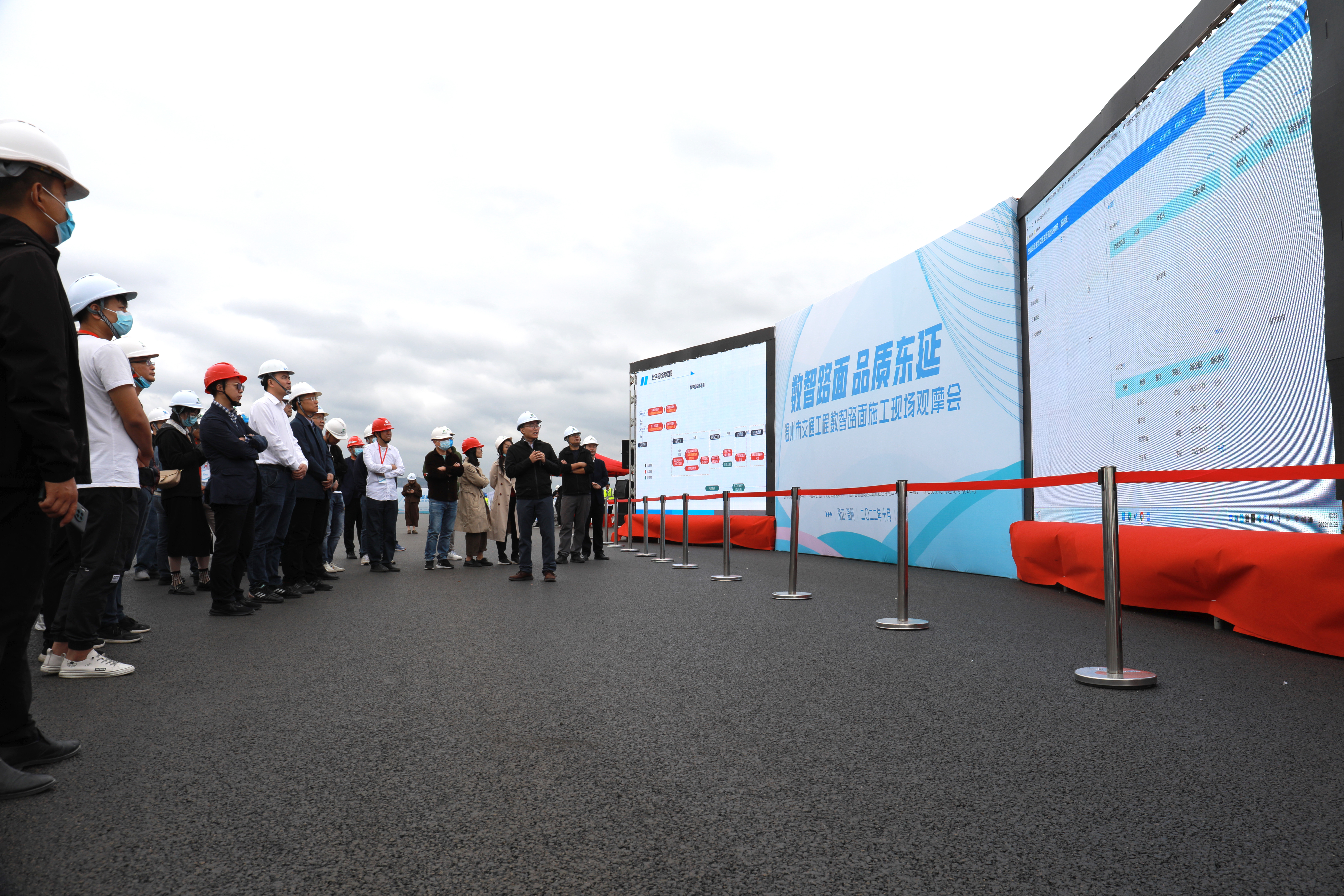 在金丽温东延项目机场枢纽主线桥沥青路面施工现场,全方位展示了沥青路面规范化施工、物联网技术应用、生产施工全过程的智慧化监管系统和数字化验收等,与会代表直观感受了施工各个环节数字化实操演示,高度评价了沥青混合料从生产到摊铺碾压全过程智能管控方面取得的成效。