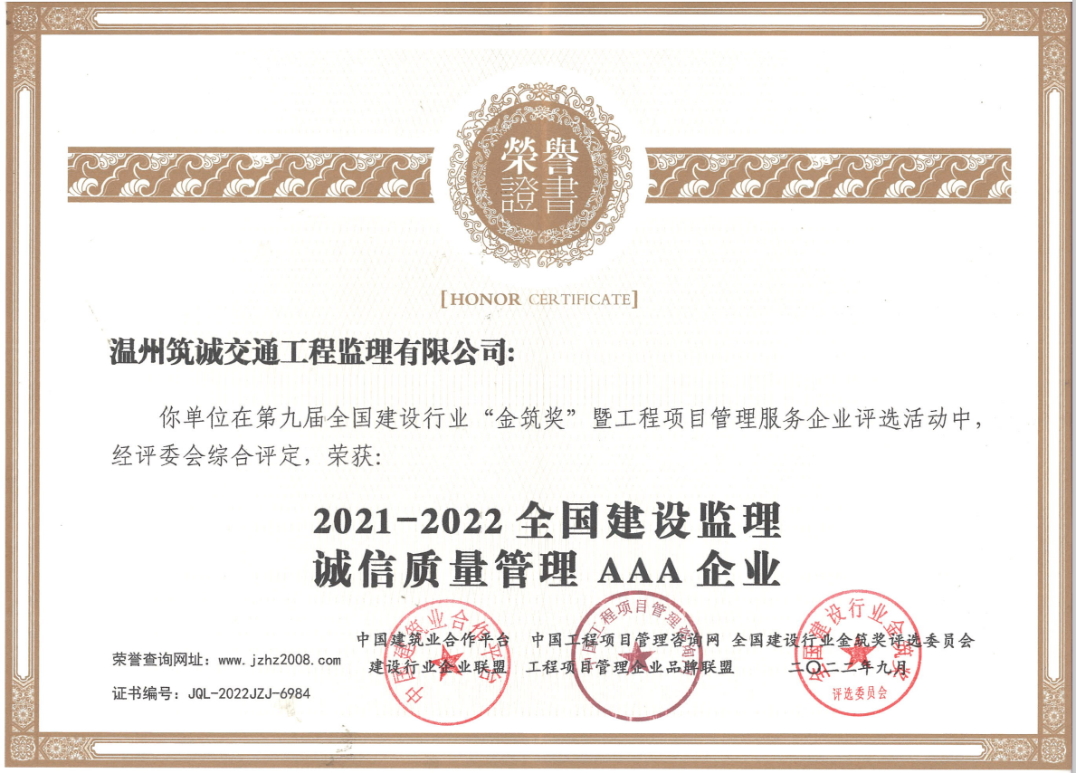 近日,第九届全国建设行业“金筑奖”评选结果出炉,诚达公司下属温州筑诚交通工程监理有限公司荣获“2021-2022全国建设监理诚信质量管理AAA企业”。