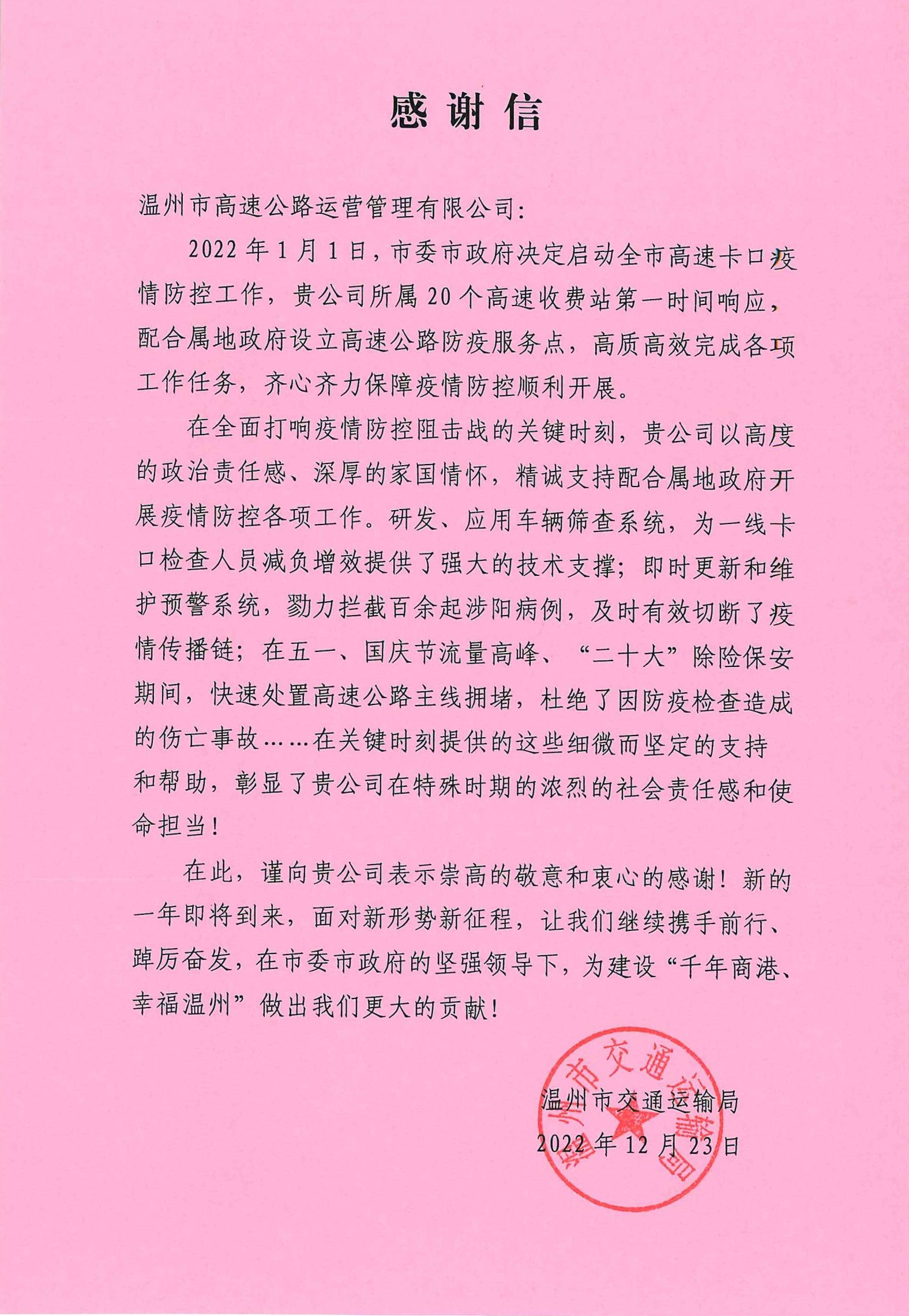 best365足球官网运营公司作为市属国有企业,将以此封感谢信为激励,勇担责任使命,持续发挥国有企业“压舱石”“助推器”“顶梁柱”作用,为建设“千年商港、幸福温州”作出更大贡献!