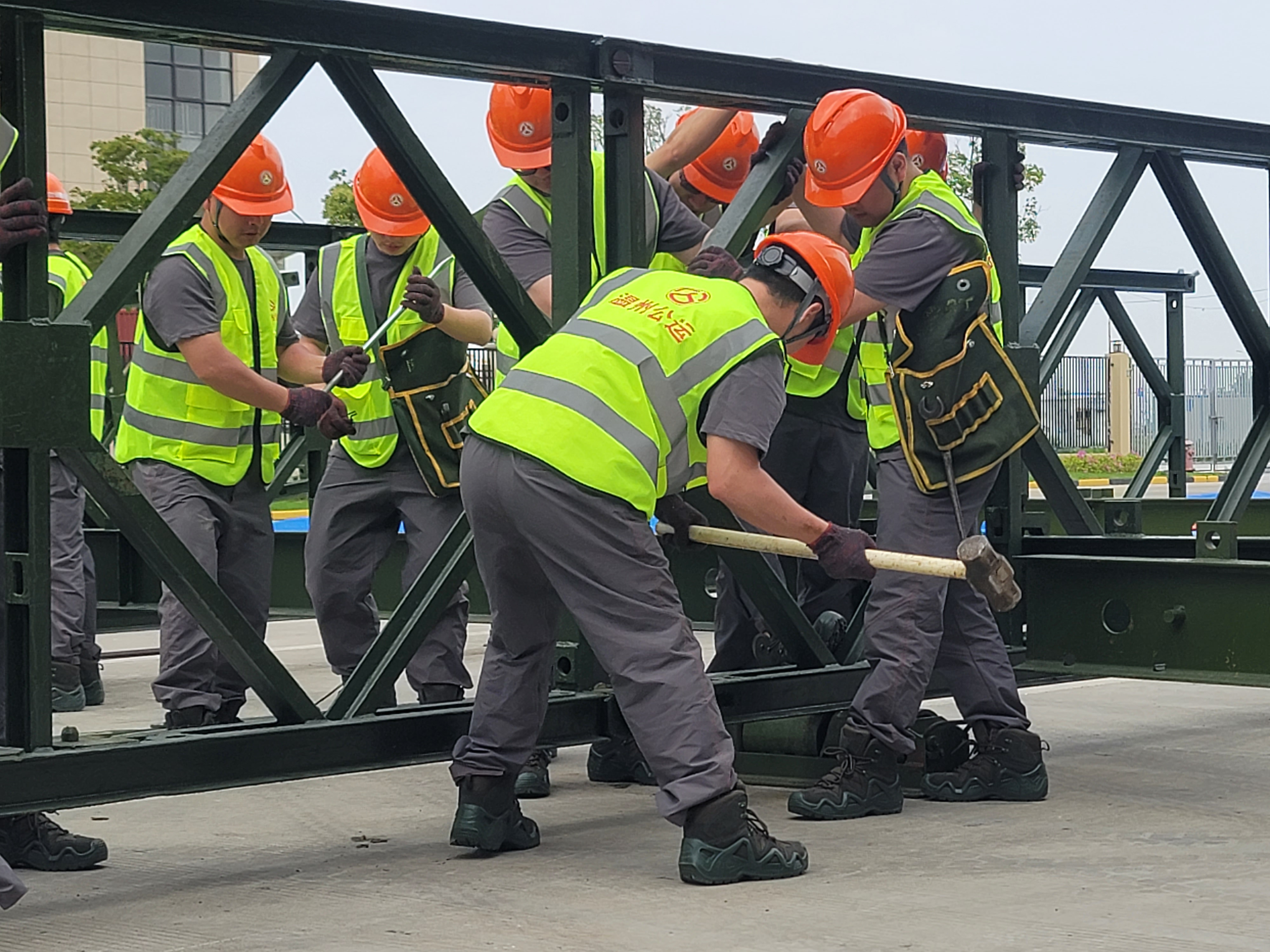 本次演练以自然灾害造成公路水毁中断为背景,架设321装配式公路应急钢桥,第一时间恢复公路畅通,具有很强的实用性、针对性和可操作性。重点是检验提升应急人员快速搭设操作技能水平、现场整体指挥协调能力。共有2只队伍同时开始架设。每组设1所6组,1所即现场指挥所,6组即桥梁搭设组、安全警戒组、技术指导组、机械保障组、后勤宣传组、现场观摩组,参演人员共计70余人。