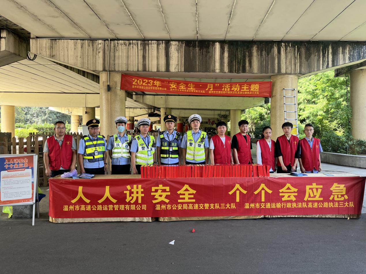 为进一步提升广大人民群众的交通安全出行意识,有效预防高速公路交通事故的发生。近日,温州市高速公路运营管理有限公司联合高速交警支队三大队、高速执法三大队,在龙湾状元文化公园路口开展“人人讲安全 个个会应急”主题宣传活动,努力营造安全、畅通、有序的高速环境。