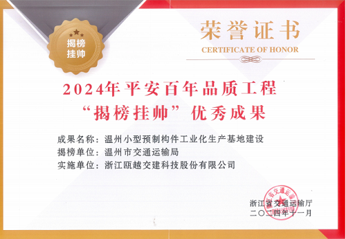 浙江2024年平安百年品质工程“揭榜挂帅”优秀成果名单揭晓,瓯越交建公司“小型预制构件示范基地”项目荣登榜单,成为温州地区唯一一家获评单位。本次评选由浙江省交通工程管理中心组织,共有10项成果被评为优秀。“平安百年品质工程”是全省交通工程建设的核心项目,旨在提升工程质量和安全水平,而“揭榜挂帅”则是推动这一目标实现的关键举措。此次入选,标志着瓯越交建公司在技术创新、生产效率和产品质量等方面的显著成就,充分展示了公司在小型预制构件行业的领先地位。