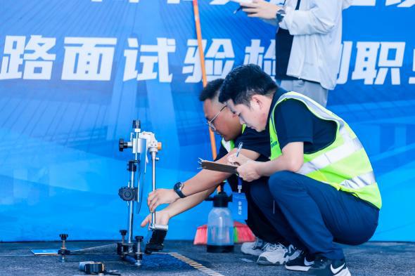 在为期两天的赛程中,来自全市24支检测队伍同台竞技。面对严谨的理论考核和复杂的实操项目,公司参赛团队沉着冷静、配合默契。在理论竞赛环节,梁超、杨吉展现出扎实的理论功底和系统的知识储备;在实际操作环节,他们围绕沥青路面摩擦系数、渗水系数等关键指标,规范操作摆式仪、渗水仪等专业设备,精准高效完成各项检测任务,数据记录详实准确,流程执行严谨到位,充分彰显了精益求精、追求卓越的工匠精神。