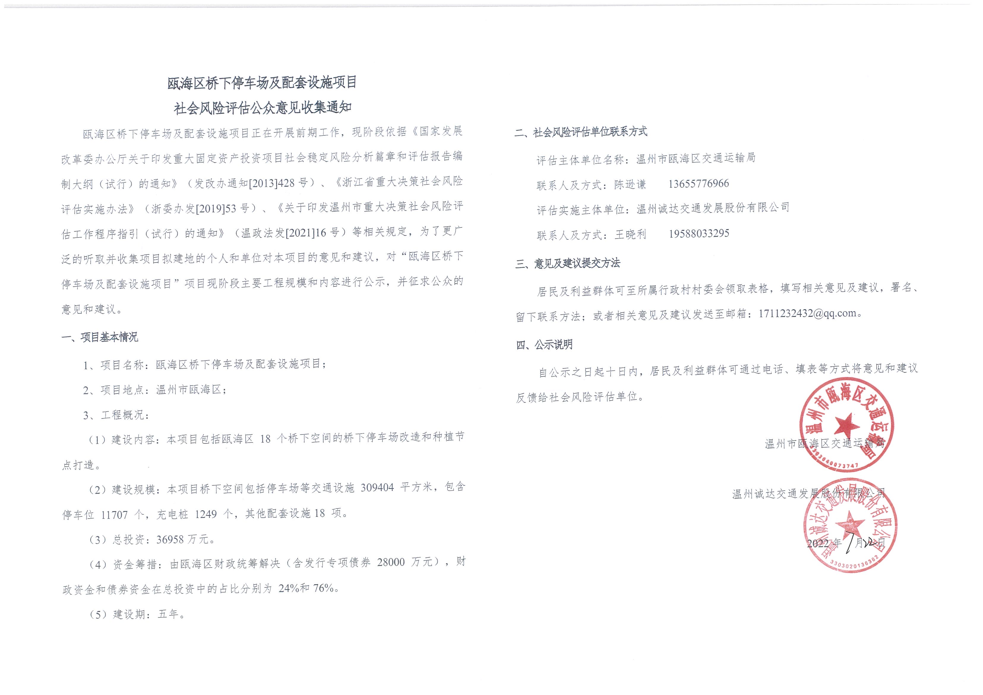瓯海区桥下停车场及配套设施项目社会风险评估公众意见收集通知