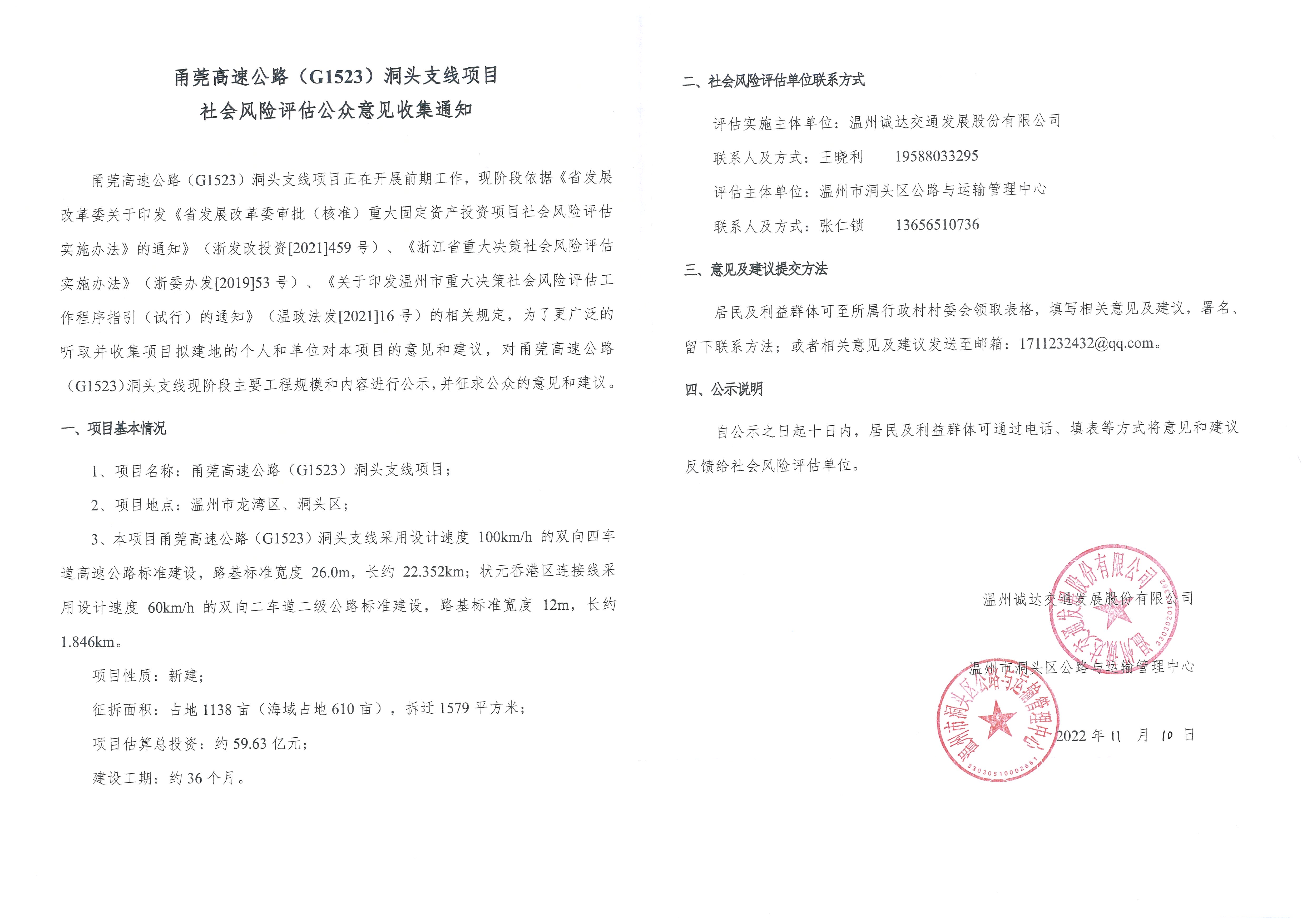 甬莞高速公路(G1523)洞头支线项目社会风险评估公众意见收集通知