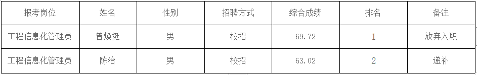 因报考温州市交通发展集团有限公司工程信息化管理员岗位总成绩排名第1名的考生自愿放弃入职资格,根据《温州市交通发展集团有限公司2023届高校毕业生校园招聘公告》,该岗位按总成绩从高分到低分进行递补,现由排名第2名的考生按规定递补参加体检考察,调整后名单如下: