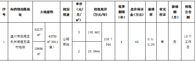 现委托温州联合产权交易中心有限公司,通过“浙交汇”平台对以下标的租赁权进行“网络动态报价”式交易,于2024年11月5日至2024年11月26日开始自由报价,2024年11月26日10时整开始限时报价,具体事宜详见“浙交汇”网站项目信息披露。