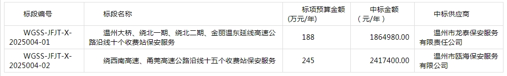 best365足球官网所属温州市高速公路运营管理有限公司关于2025-2027年高速公路收费站点保安服务(标段一、标段二)项目的采购结果公示