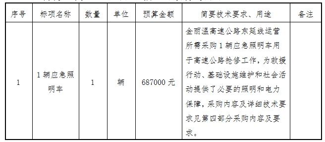 根据《温州市市属国有企业采购管理办法》《温州市交通发展集团有限公司国有企业采购管理办法》等有关规定,温州市远景交通工程管理有限公司受温州金丽温高速公路东延线有限公司委托,就所需1辆应急照明车以公开招标的方式进行采购,欢迎国内合格的投标供应商前来投标。