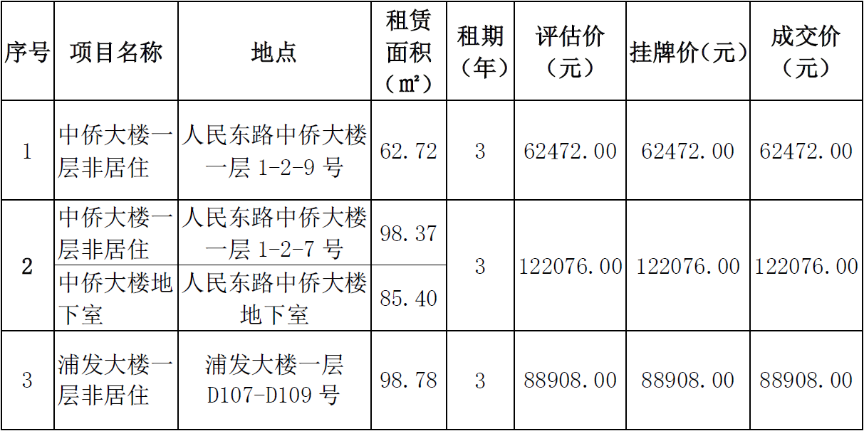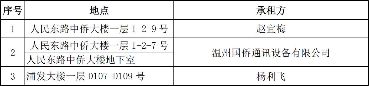 温州市交通发展集团有限公司下属温州房地产开发股份有限公司就所属尚品商务楼、中侨大楼等多处资产项目于2021年8月13日发布招租公告,现将招租结果公示如下: