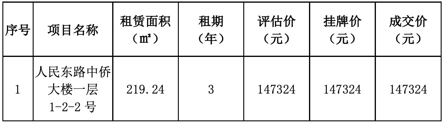 温州市交通发展集团有限公司下属温州房地产开发股份有限公司就所属鹿城区人民东路中侨大楼一层1-2-2号资产项目于2022年2月15日发布招租公告,现将招租结果公示如下: