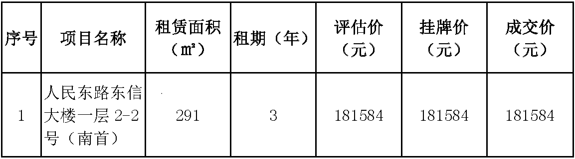 温州市交通发展集团有限公司下属温州房地产开发股份有限公司就所属鹿城区人民东路东信大楼一层2-2号(南首)资产项目于2022年6月20日发布招租公告,现将招租结果公示如下: