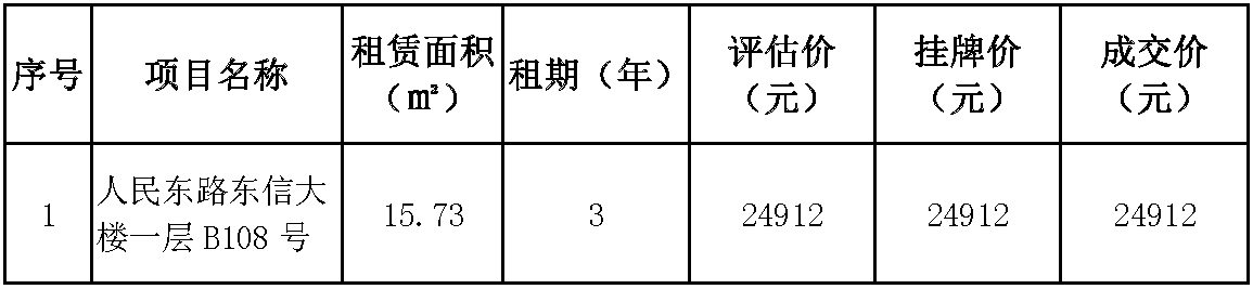 温州市交通发展集团有限公司下属温州房地产开发股份有限公司就所属鹿城区人民东路东信大楼一层B108号资产项目于2022年6月30日发布招租公告,现将招租结果公示如下: