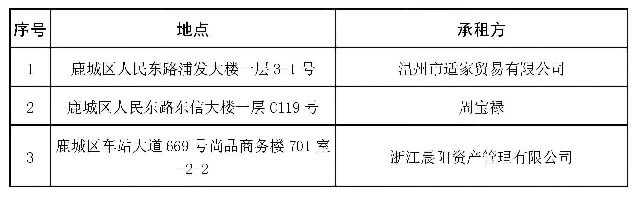 温州市交通发展集团有限公司下属温州房地产开发股份有限公司就所属浦发大楼一层3-1号、东信大楼一层C119号、尚品商务楼701室-2-2资产项目于2022年9月5日发布招租公告,现将招租结果公示如下: