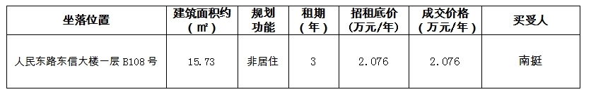 温州房地产开发股份有限公司就温州市鹿城区人民东路东信大楼一层B108号非居住用房三年租赁权于2024年9月24日至10月11日进行公开招租,经评估机构评估、委托产权交易中心拍卖及公开竞价并按相关程序审批,已完成公开拍卖,现将拍卖结果公示如下: