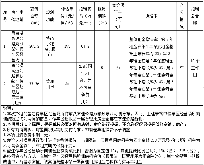 best365足球官网经营公司关于甬台温高速公路复线鳌江停车区经营场所、鳌江停车区超限站一层管理用房2处房产五年租赁权交易公告