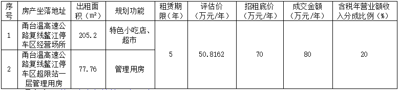 温州市高速公路资产经营有限公司甬台温高速公路复线鳌江停车区经营场所、鳌江停车区超限站一层管理用房2处房产五年租赁权项目于2024年11月26日发布招租公告,在2024年12月10日完成招租结果确认,现将招租结果情况公示如下:
