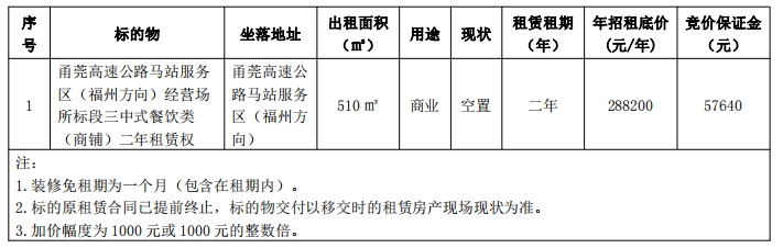 best365足球官网所属温州市高速公路资产经营有限公司关于甬莞高速公路马站服务区(福州方向)经营场所标段三中式餐饮类(商铺)二年租赁权交易公告