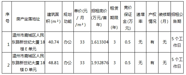 best365足球官网经营公司关于温州市鹿城区人民东路新世纪大厦18楼D单元五年租赁权(第二次)、18楼E单元办公房三年租赁权(第三次)交易公告