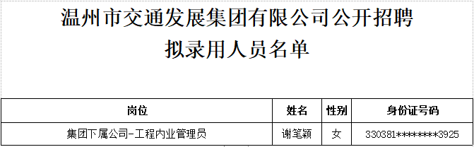 温州市交通发展集团有限公司公开招聘拟录用人员名单公示(二)