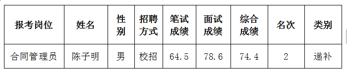 因个别岗位人员体检不合格等原因,导致集团下属温州文青高速公路有限公司的合同管理员岗位出现缺额。根据《温州市交通发展集团有限公司招聘工作人员公告》相关规定,现将从同岗位应聘人员中,按综合成绩从高分到低分,确定递补人员。具体名单如下:
