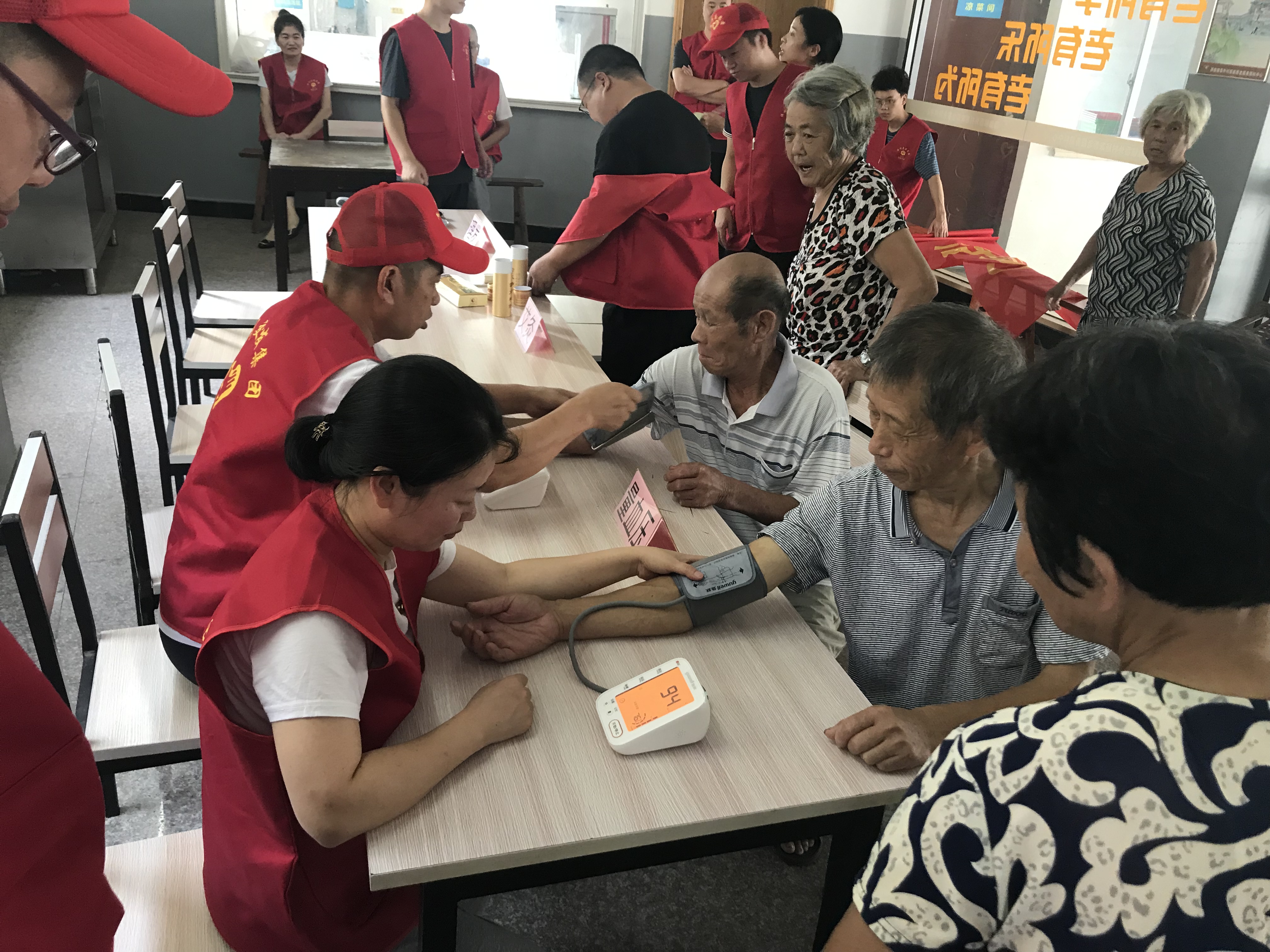在林岙村村委会办公楼里,志愿者们有的为村民们量血压、有的在为村民们艾灸、有的在为村民们理发,现场十分热闹。与此同时,水库党支部还对村里的三位困难老党员进行慰问。