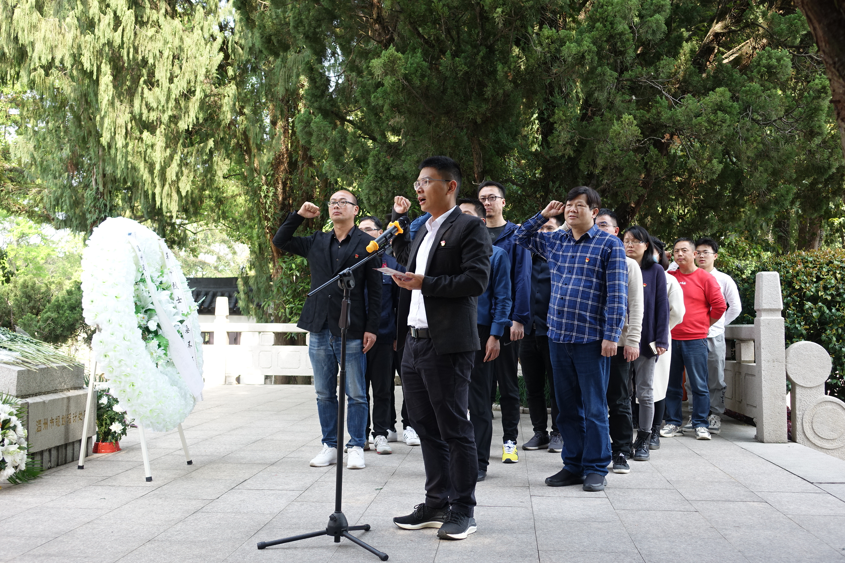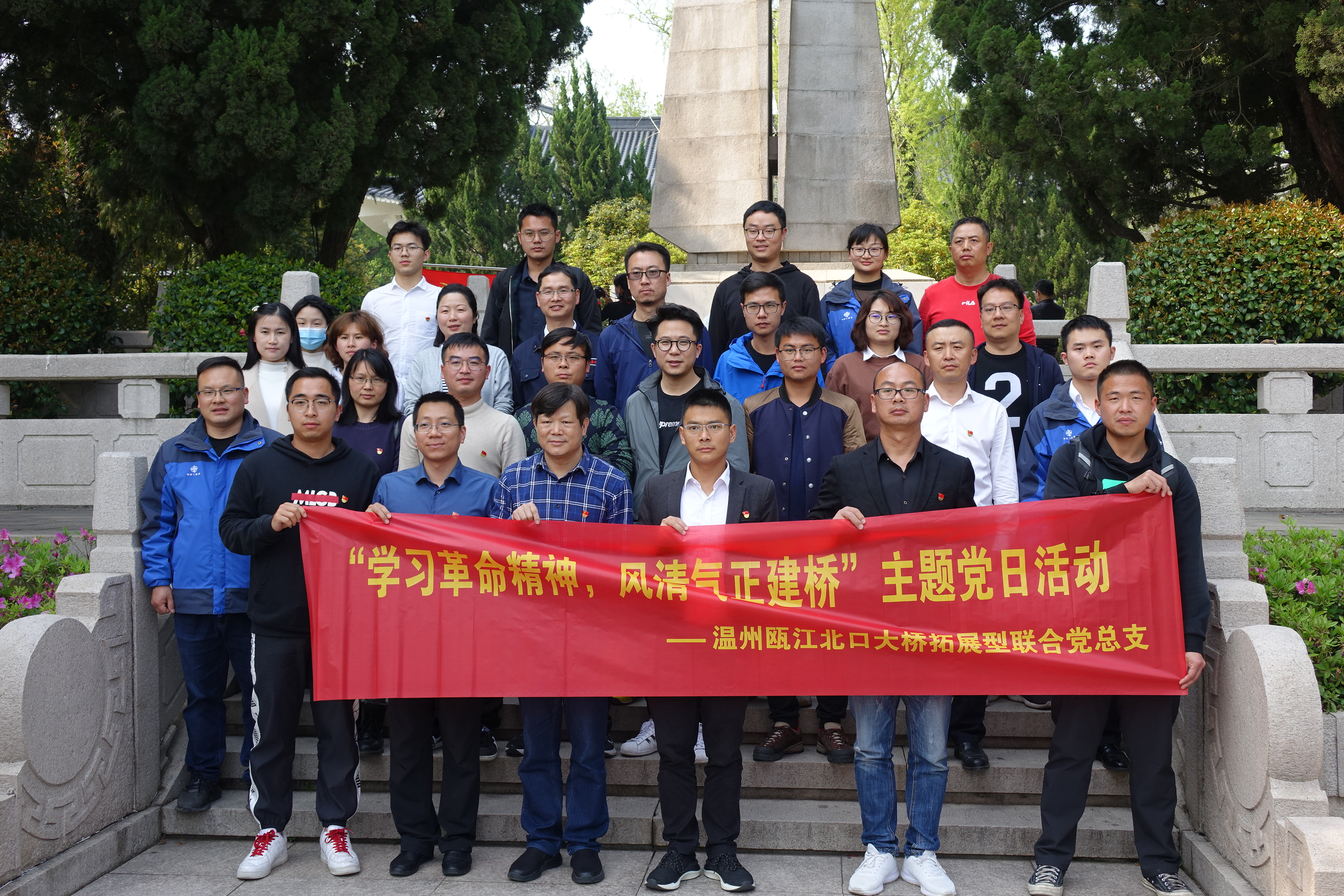 温州江心屿烈士纪念碑四周苍松矗立、翠柏葱茏,历史无言,精神不朽;英雄已逝,浩气犹存。全员排起整齐的方阵,在庄严肃穆的氛围中怀着无比崇敬的心情敬献花圈、挽联,鞠躬默哀以表哀思。党员面对党旗重温入党誓词,回忆初心。