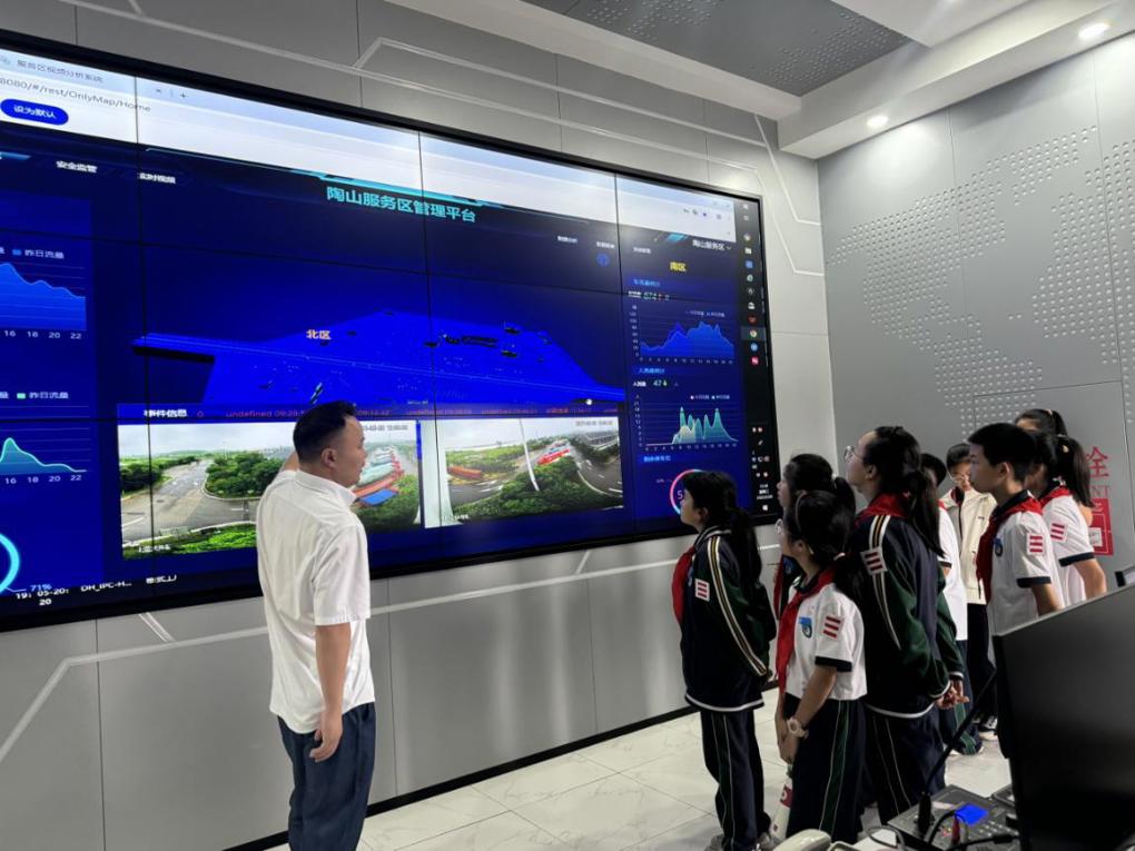 活动首站,陶山镇中心小学30名学生走进陶山服务区智慧管理中心。通过陶山服务区负责人现场讲解,学生们直观了解服务区实时监控系统运作模式,观摩智慧大屏对停车区、商超、卫生间的全景监测功能。数字化管理手段让同学们感受到现代交通服务的精准高效,有学生感慨:“原来科技让高速公路服务如此智能!”