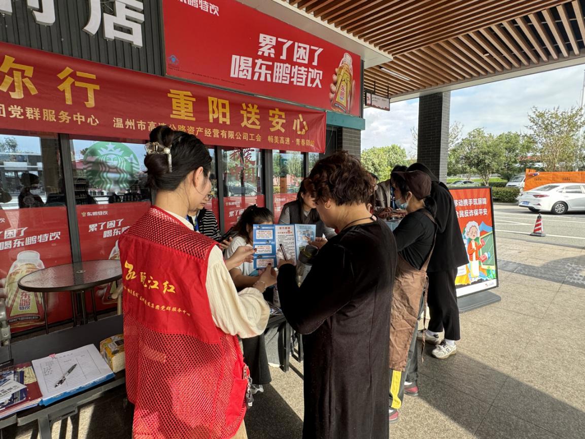 金秋重阳至,10月29日,“瓯江红·畅美高速”温州交发集团党群服务中心联合瑞安移动陶山分公司、高速交警等单位,在服务区开展“反诈伴你行,重阳送安心”主题活动,将敬老传统与反诈宣传相结合。