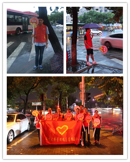 忙碌的下班高峰期,尽管天下着大雨,但是志愿者们手持“大拇指”指引牌,坚守在龙湾区雁荡西路上江路口、清江路口、楠溪江路口等交通拥堵路段十字路口,劝导车辆行人遵守交通规则,帮助老弱残者和问路行人,为遵守交通规则、文明礼让、互帮互助的行人竖起“大拇指”点赞。“您好,请自觉遵守交通法规”、“您好,红灯,请稍等”,华灯初上,一句句善意的提醒,为忙碌的城市增添了几分暖意。