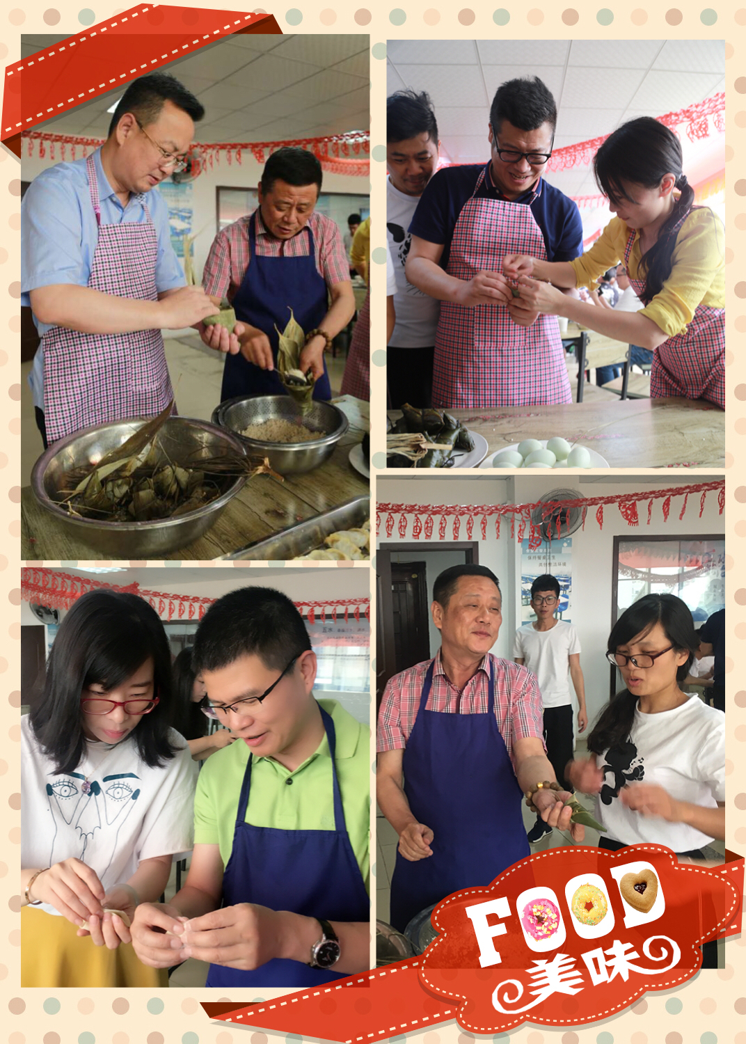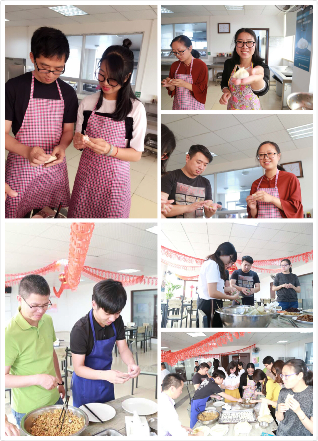 公司领导班子及各部门的十多名员工代表在公司四楼餐厅集合。活动现场放满了糯米、粽叶、大枣、博饼皮、肉馅、饺子等材料,职工们围在一起包粽子、包饺子、做薄饼,大家忙得不亦乐乎。正方形、三角形、五角形、长条形……各式各样的粽子陆续诞生。