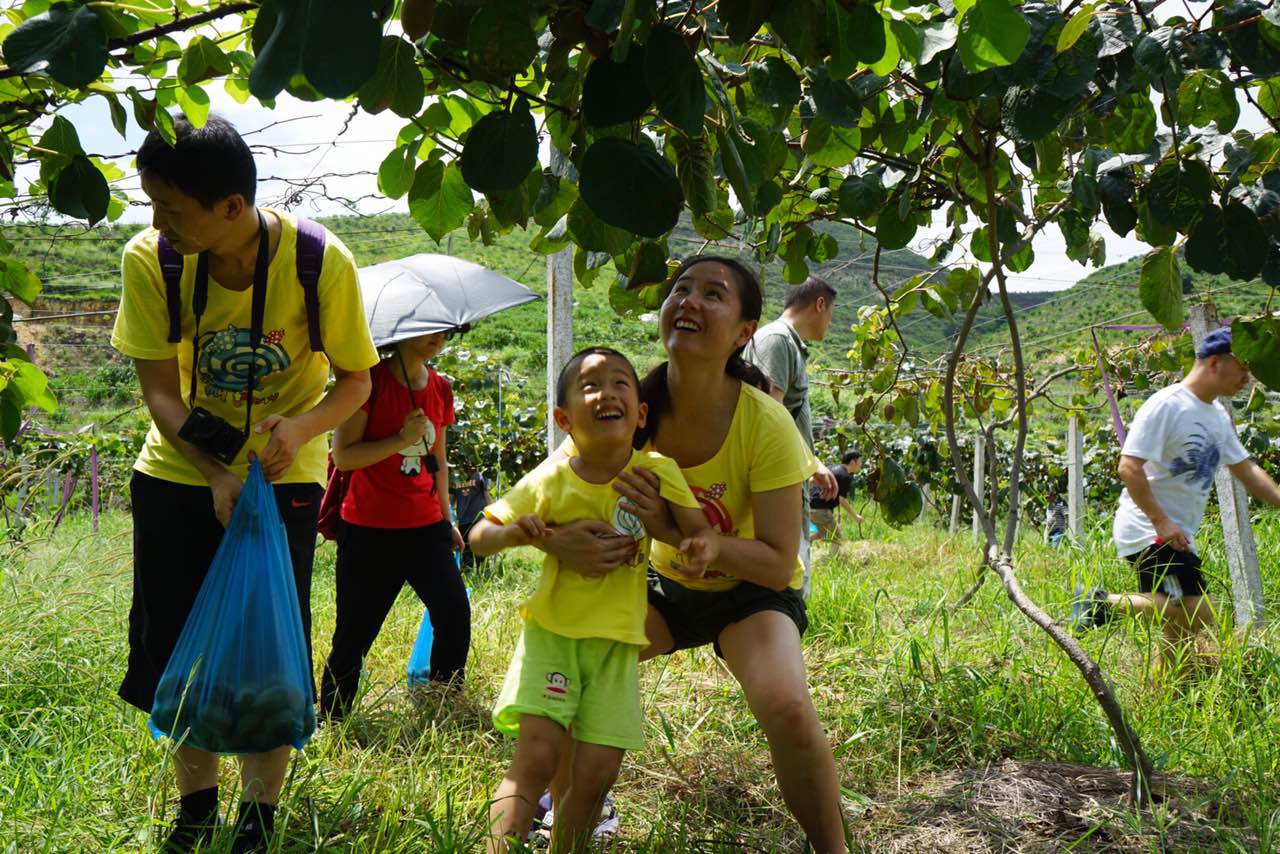 经过一小时环山颠簸,上午9点,大家顺利抵达果园。在一片欢声笑语中,大家开始了欢乐采摘之旅。尽管头顶烈日,额头挂着汗珠,但所有人都乐在其中,这些伴随绕西南工程一起成长的“小萝莉”、“小正太”在欢呼着钻进果园,享受难得的田园风光,有些家庭开启全家总动员模式,爸爸负责拎着采来的水果,妈妈抱着孩子去树上的桃子,小朋友认真挑选饱满的桃子和猕猴桃。看着烈日下辛勤劳作收获的成果,大家脸上都乐开了花。每个人都在大自然中卸掉一身疲惫,享受着轻松与惬意,小朋友们也学到了许多在课堂内学不到的知识。