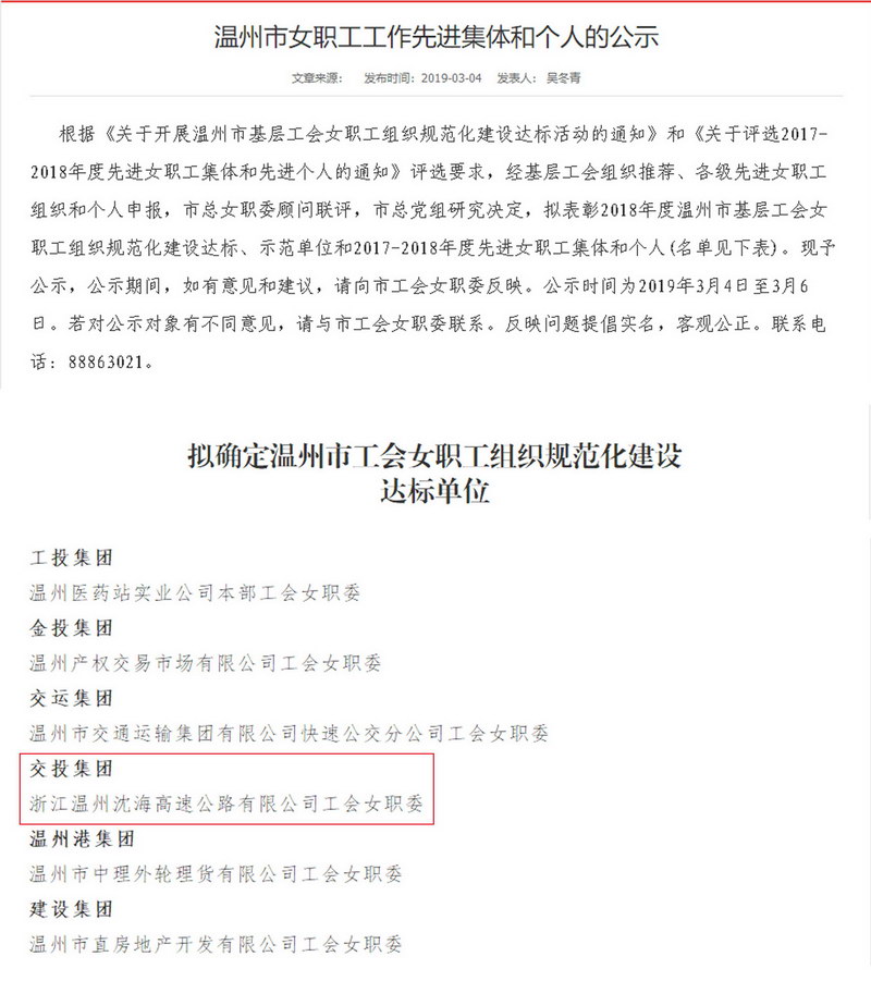 近日,温州市总工会发布公示,拟表彰2018年度温州市基层工会女职工组织规范化建设达标等荣誉称号。浙江温州沈海高速公路有限公司工会女职委荣获达标单位荣誉称号。