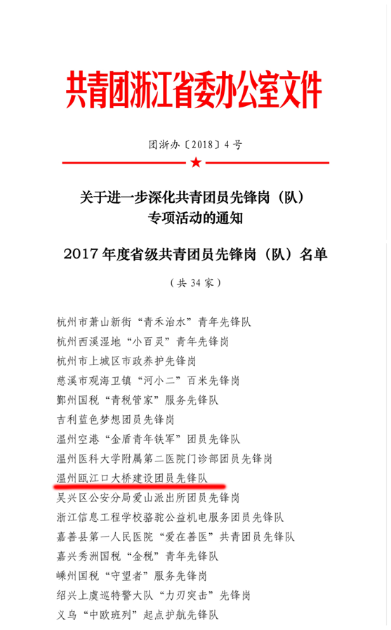 瓯江北口大桥团青荣获2017年度“省级共青团员先锋岗(队)”